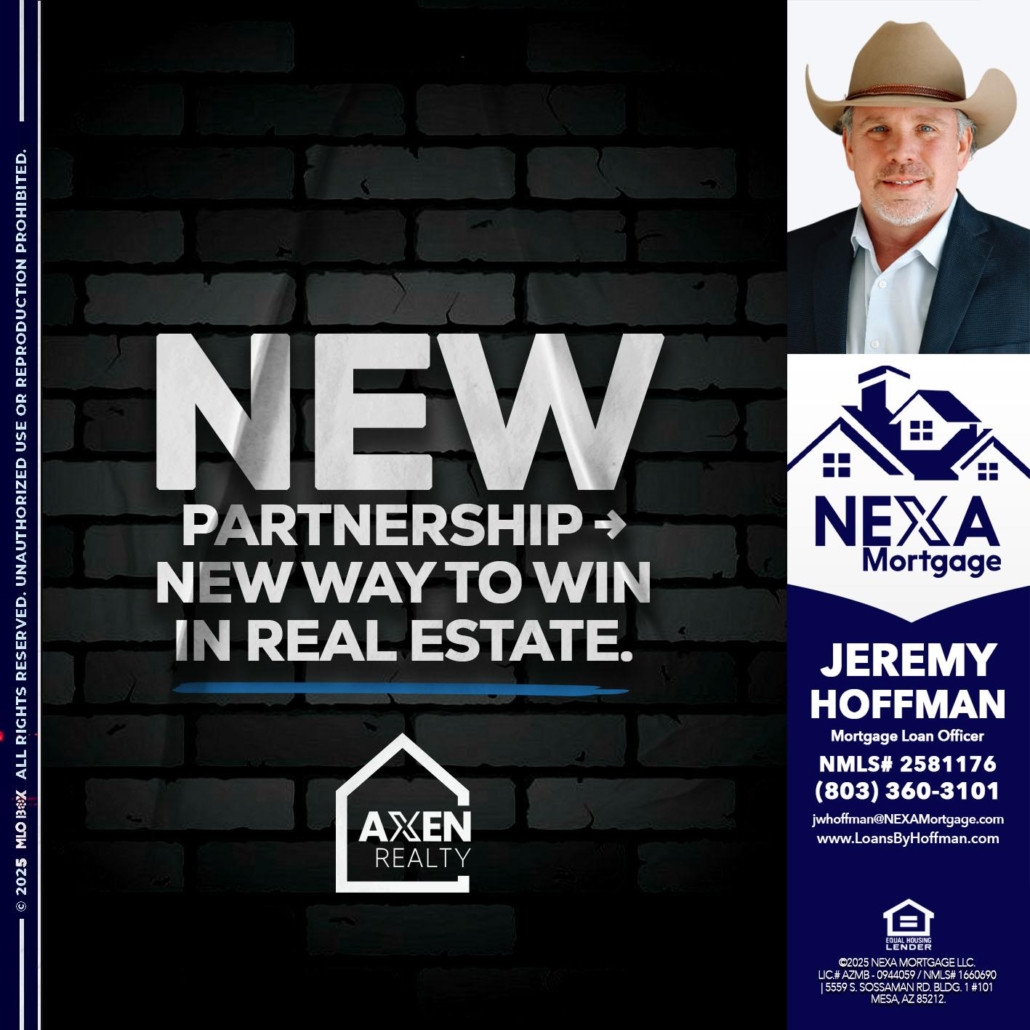 new partnership - Jeremy Hoffman -Mortgage Loan OfficerHi, my name is Jeremy Hoffman. I’m a Loan Officer with NEXA Mortgage LLC., offering personalized mortgage solutions, fast customized quotes, great rates and service with integrity.