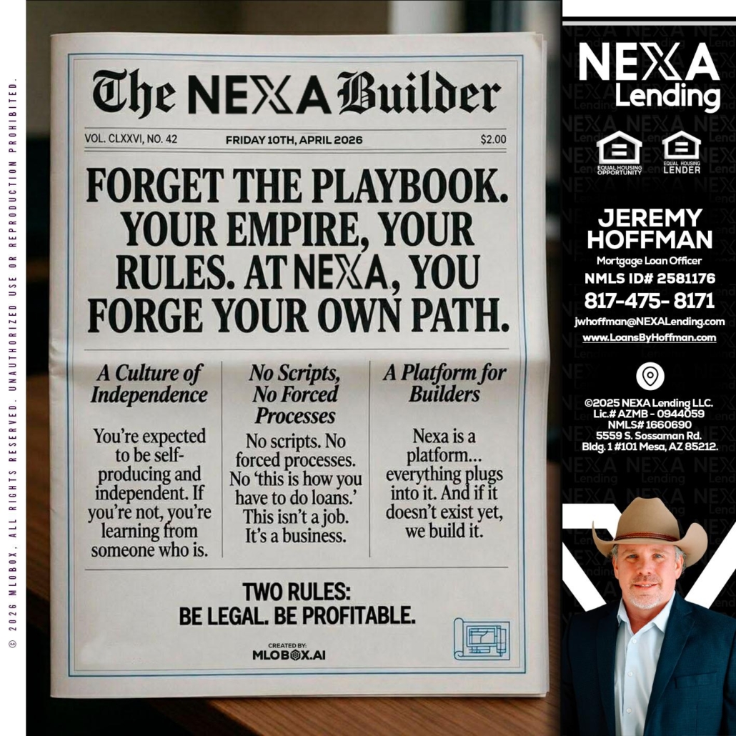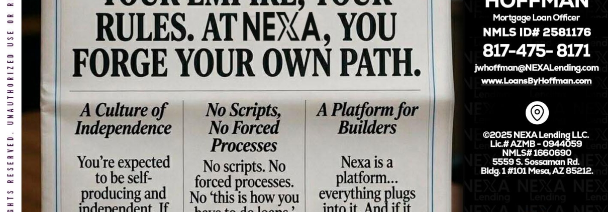 Hi, my name is Jeremy Hoffman. I’m a Loan Officer with NEXA Lending LLC., offering personalized mortgage solutions, fast customized quotes, great rates and service with integrity.